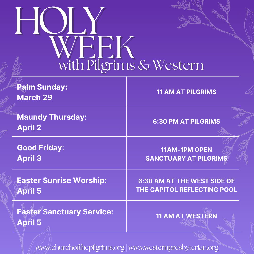 The First and Second Sundays of every month, we worship at Western Presbyterian Church (2401 Virginia Ave NW) or online click here.