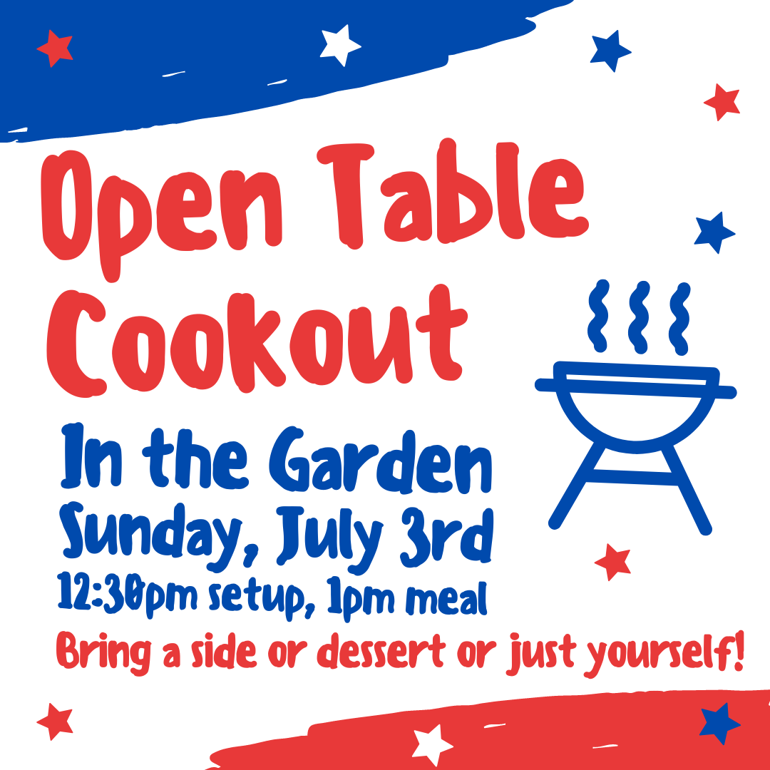 Come for worship on Sunday, July 3rd and stay after for a meal. We’ll join with Open Table guests and volunteers for a holiday weekend cookout. Join us as we fire up the grill and bring lots of yummy sides. Contact the church office if you’d like to bring something to share! All are welcome, all are invited!